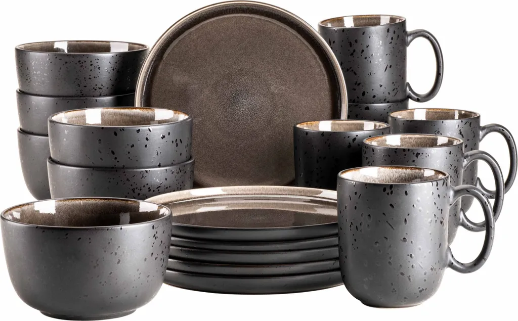 Die unvergleichliche Keramikgeschirr-Serie „Niara“ der österreichischen Traditionsmarke Mäser verbindet auf einzigartige Weise selbstbewusste skandinavische Formen mit zwei unterschiedlichen, aufwändigen Glasurtechniken: Auf den Ober- bzw. Innenseiten der Geschirrteile fließen strahlende Farbschattierungen auf schwarzem Untergrund zu wunderbaren Maserungen zusammen. Die Außen- bzw. Unterseiten hingegen bestechen durch eine Mattglasur in Schwarz, welche mit glänzenden schwarzen Sprenkeln überzogen wurde. Durch die händisch aufgetragenen Farben ist jedes Teil in dieser Kollektion auf allen Seiten einzigartig gemustert. Mit ihrem exquisiten und individuellen Charakter ist die Kollektion „Niara“ ein echter Hingucker auf jedem Esstisch. Gefertigt aus langlebigem, hochwertigem Steinzeug (welches nicht mit dem deutlich brüchigeren Steingut zu verwechseln ist) wird Ihnen dieses Geschirrset lange Freude bereiten. Selbstverständlich ist die gesamte Serie „Niara“ mikrowellen- und spülmaschinengeeignet. Bitte beachten Sie: Diese Kollektion wird händisch lasiert, wodurch minimale Unebenheiten der Glasur, kleine Einschlüsse und leichte Farbabweichungen auftreten können. Zur besseren objektiven Vergleichbarkeit gehen unsere Füllmengenangaben von einer randvollen Befüllung aus.