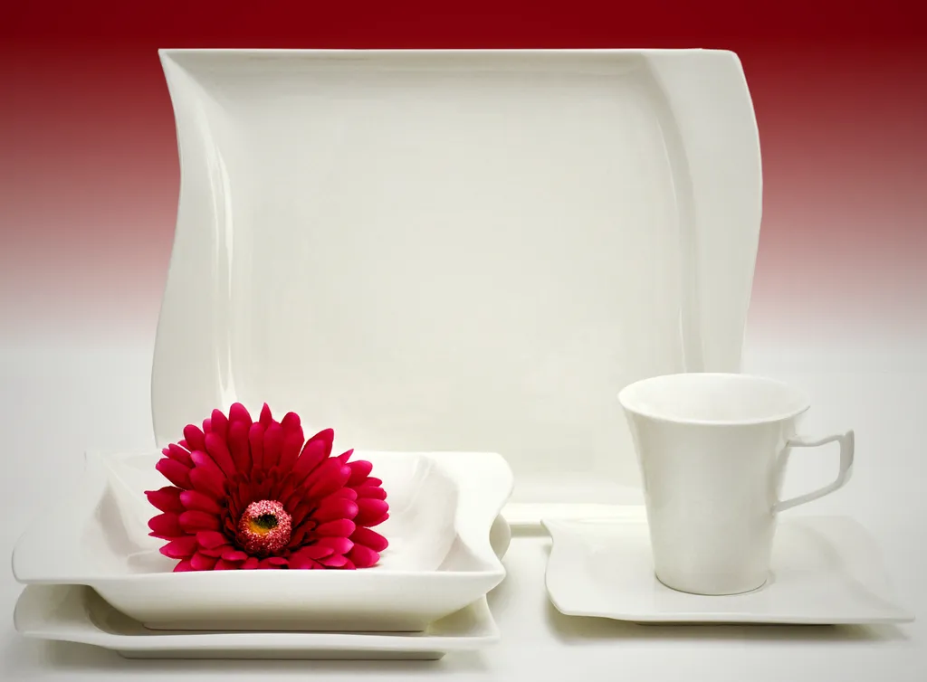 Die Tassenform ist Rund gehalten, bis auf die Henkel die sind in einem eckigen Design. Die Teller sind alle in ihrer Form ähnlich und unterscheiden sich nur in ihrer Größe, zusätzlich hat der flache Teller noch ein minimales Reliefmuster in der Mitte in Form eines Viereckes.