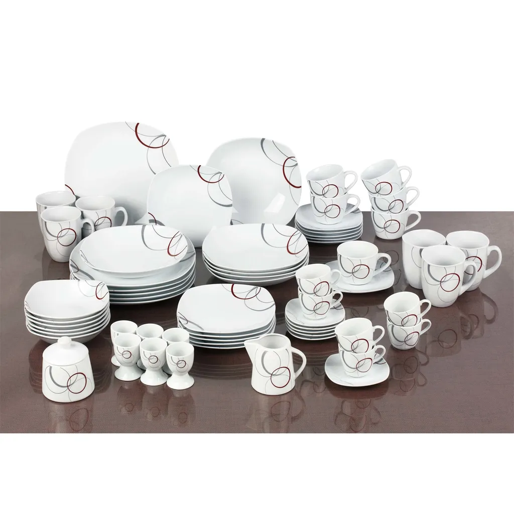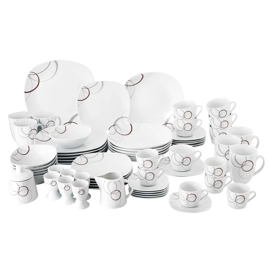 Das 62-teilige Palazzo Kombiservice mit moderner Form und grafischemNachbildung ist für jede Gelegenheit das passende Service. Das Kombiservice wurde aus Porzellan hergestellt und ist spülmaschinenfest sowie mikrowellengeeignet. Neben jeweils sechs Kaffee-Tassen, Untertassen, Dessertellern, Suppentellern, Speisetellern, Müslischalen, Kaffeebechern, und Eierbechern sind auch Espresso-Tassen sowie -Untertassen vorhanden. Außerdem beinhaltet das Service einen Gießer und eine Zuckerdose.