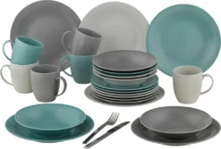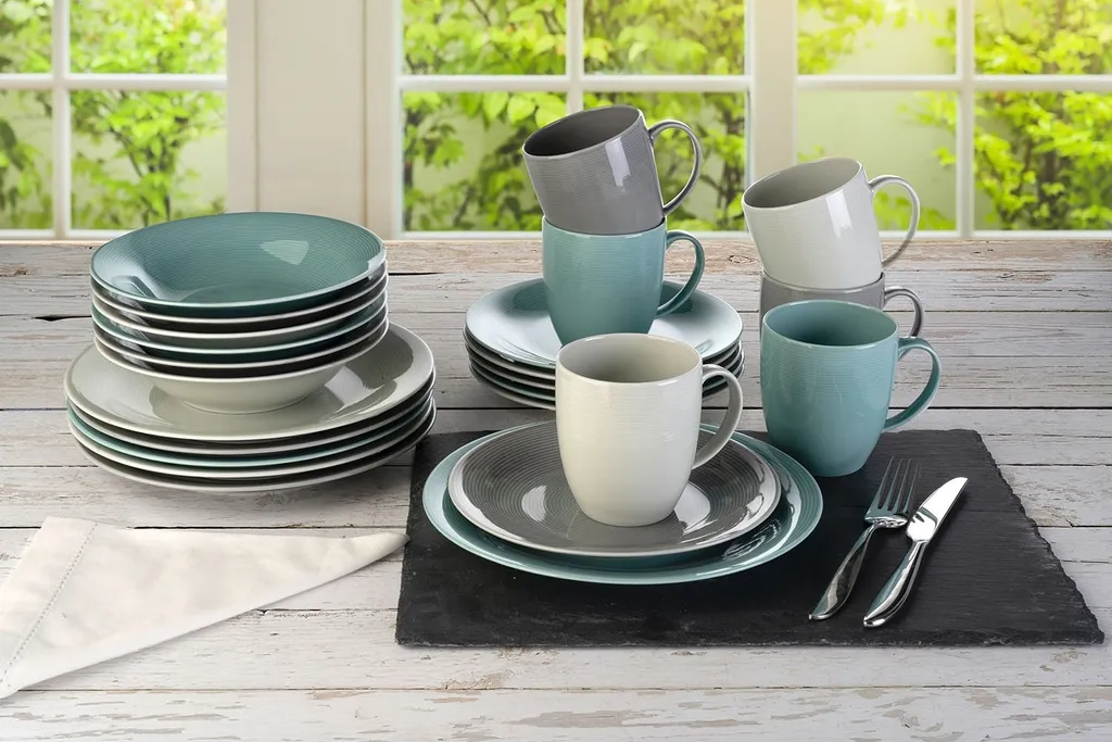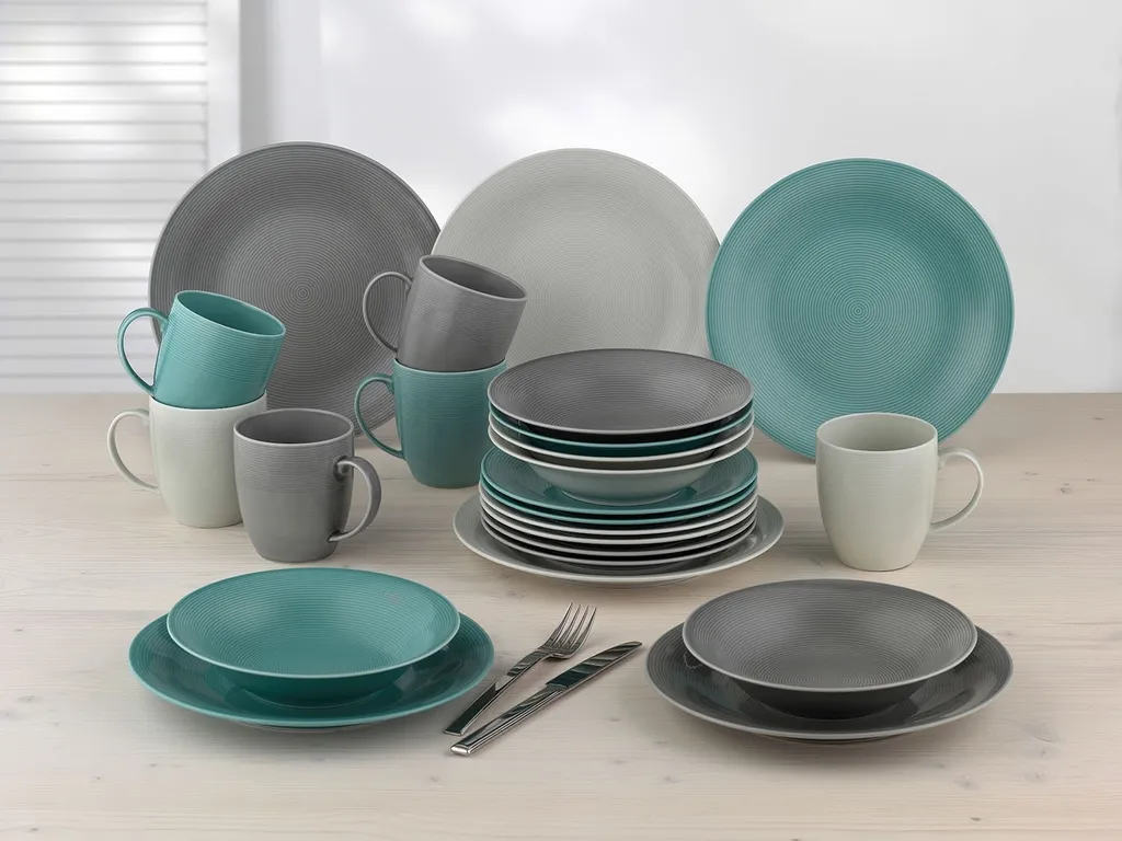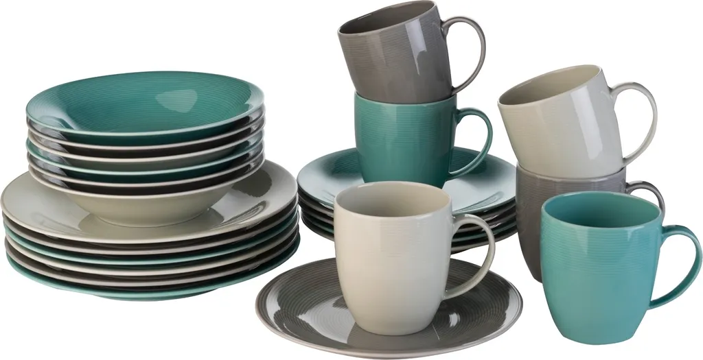 Ergänzen Sie Ihre Küchenausstattung durch dieses schöne Kombiservice aus hochwertigem Porzellan. Es überzeugt mit extravagant gewellten Tellerrändern und einer schönen Farbkombination. Das Geschirr-Set besteht aus je 6 Kaffeebechern, Desserttellern und flachen sowie tiefen Speisetellern. Die einzelnen Teile sind sowohl mikrowellen- als auch spülmaschinengeeignet.