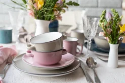 Herbstliche frische Farben und originelle, an traditionelles Emaille-Geschirr angelehnte Formen sorgen für gute Laune, der dunkel abgesetzte Rand zugleich für klare Linien. Je nach Stimmung und Bedarf kombinieren Sie mit Maila die vier sorgfältig aufeinander abgestimmten verfügbaren Farben altrosa, dunkelblau, petrol und beige zu einem harmonischen Ensemble.