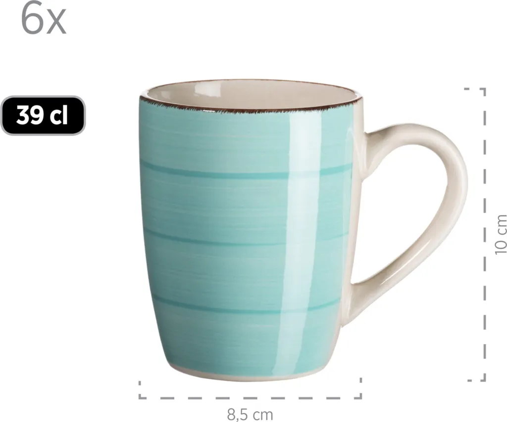 - ‚Dieses moderne, rustikal anmutende Geschirrset besteht aus 6x Speiseteller, 6x Suppenteller, 6x Dessertteller, 6x Müslischale und 6x Kaffeebecher (390 ml) in der Farbe Laguna (ein bläulicher Türkis-Ton)