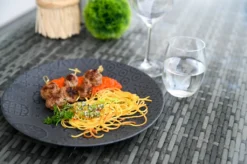 Wenn traditionelle portugiesische Azulejo-Ornamente auf ein edles mattschwarzes Finish treffen, verbinden sich Tradition und Moderne zu edlen Schmuckstücken. Die unter nachhaltigen Bedingungen in Portugal hergestellte Keramikgeschirr-Kollektion „Tiles“ der Traditionsmarke MÄSER transportiert die jahrtausendealte Faszination maurischer Kunst in Form eines haptisch fühlbaren Nachbildungs auf jedem Teil dieses Tafelgeschirr-Sets, und hüllt sie in unvergleichlicher Weise in eine trendige Mattglasur. Die modernen, runden Coupe-Formen lassen dem außergewöhnlichen Nachbildung sowie Ihren kulinarischen Kreationen viel Raum. Hinterlassen Sie mit dieser Kollektion nicht nur bei Ihren Gästen einen bleibenden Eindruck, sondern verwandeln Sie jede Ihrer Mahlzeiten in einen wahren Augenschmaus! Die Serie „Tiles“ ist aus Steinzeug gefertigt – einer hochwertigen Form der Keramik, die nicht mit dem brüchigeren und poröseren Steingut zu verwechseln ist. In seiner täglichen Handhabung unterscheidet sich hochwertiges Steinzeuggeschirr kaum von Porzellangeschirr: Die gesamte Serie ist mikrowellen- und spülmaschinengeeignet, hitzebeständig und tiefkühlgeeignet und damit absolut alltagstauglich. Bitte beachten Sie: Aufgrund der besonderen Oberflächenbeschaffenheit der Mattglasur kann es beim Schneiden auf den Tellern zu Besteckabrieb und ungewohnten Kratzgeräuschen kommen. Die feinen metallischen Linien, welche sich durch Besteckabrieb auf Tellern abzeichnen können, beeinflussen die Funktionalität des Geschirrs nicht und können bei Bedarf mit Porzellanreiniger entfernt werden. Zur besseren objektiven Vergleichbarkeit gehen unsere Füllmengenangaben stets von einer randvollen Befüllung aus.