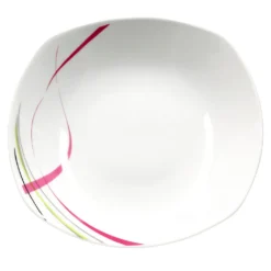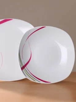 12tlg. Tafelservice Fashiom von vanWell. Moderne eckige Form mit abgerundeten Ecken. Aus hochwertigem weißen Porzellan mit einem trendigenNachbildung in grün, lila, grau und schwarz. Spülmaschinen- und mikrowellengeeignet. Für 6 Personen. Bestehend aus: 6 Teller flach Ø 25 cm und 6 Teller tief Ø 21,5 cm.