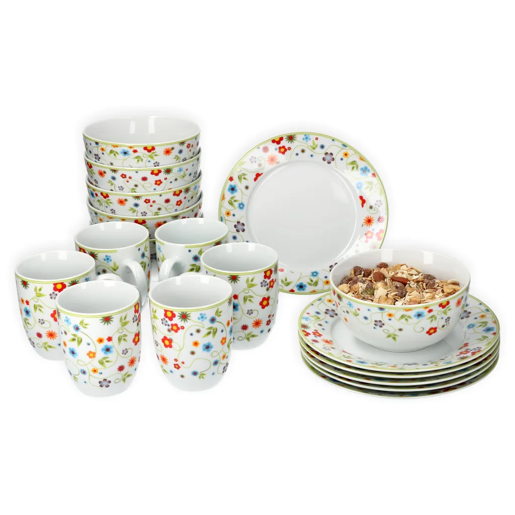 - Frühling: 6 Frühstücksteller (2x grün, 2x orange, 2x Blumenprint); 6 Kaffeebecher (2x grün, 2x orange, 2x Blumenprint) und 6 Müslischalen (2x grün, 2x orange, 2x Blumenprint)