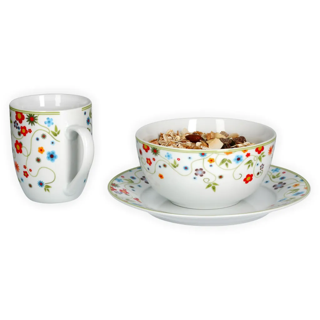 Van Well 18teiliges Frühstücksset, Serie VARIO, 6 Dessertteller, 6 Kaffeebecher, 6 Müslischalen, feines Porzellan, versch. Farben