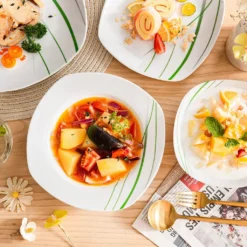 - Im 100-teiligen Set enthaltend: 12 Speiseteller (L 24,7 x B 24,7 x H 2,2 cm), 12 Dessertteller (L 19,2 x B 19,2 x H 2 cm), 12 Suppenteller (180 ml, L 21,5 x B 21,5 x H 3,8 cm), 12 Müslischalen (440 ml, L 17 x B 17 x H 5 cm), 12 Kaffeebecher (350 ml, Ø 8,6 x H 10,2 cm), 12 Eierbecher (Ø 4,8 x H 6,8 cm), 12 Kaffeetassen (220 ml, Ø 8 x H 6,7 cm), 12 Untertassen (L 14,7 x B 14,7 x H 1,7 cm), 2 Milchkännchen (180 ml, 11,5 x 7,5 x 8,5 cm), 2 Zuckerdose mit Deckel (250 ml, 9,5 x 9,5 x 10,5 cm).