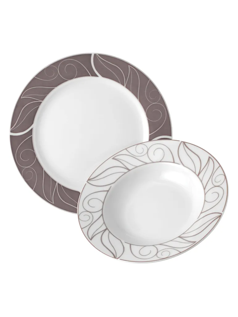 12tlg. Tafelservice ‚Grenoble‘. Runde Form. Weiß mit einemNachbildung in braun-grau. Spülmaschinen- und mikrowellengeeignet. Material: Porzellan. Bestehend aus: 6 Teller tief (22,0 cm ), 6 Teller flach (24,0 cm) Material: Porzellan.