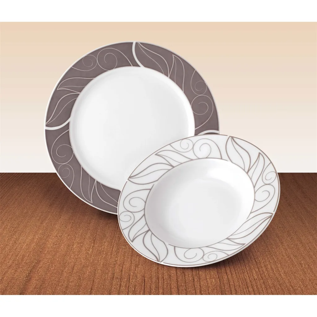 Das Porzellan Tafelservice Grenoble besticht durch seine klassische runde Form, verziert mit feinem Blumen- und Rankendekor in braun-grau.